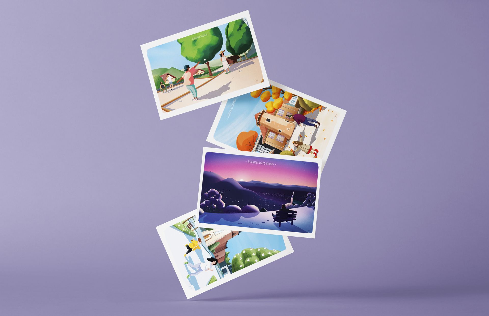 Je réalise une série de quatre illustrations originales destinées à l'édition de cartes postales pour la boutique postale de Lucinges. Chaque carte représente un lieu emblématique du village, mis en scène à travers les quatre saisons : printemps, été, automne et hiver.