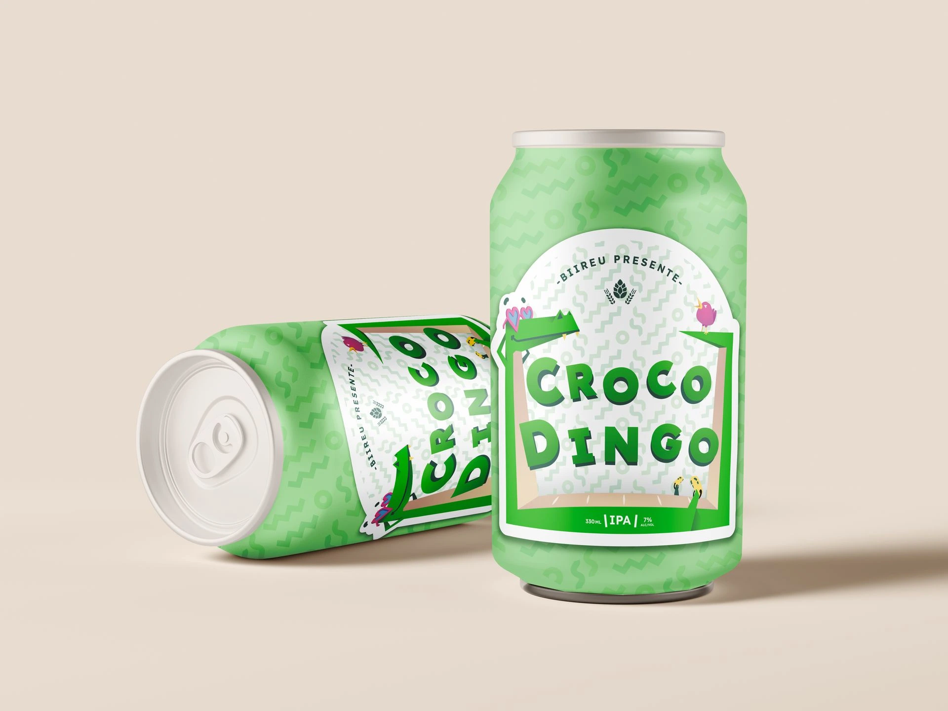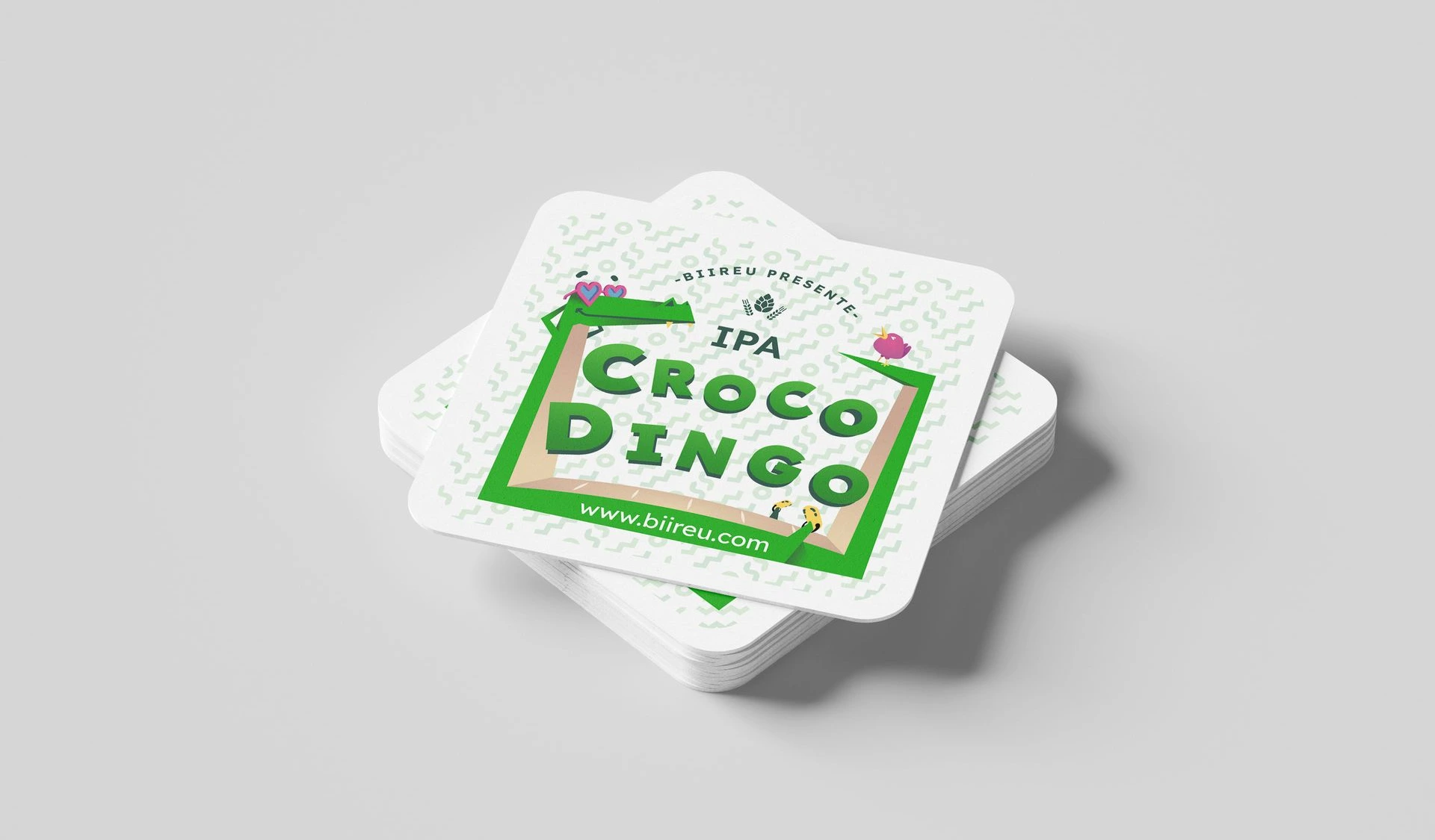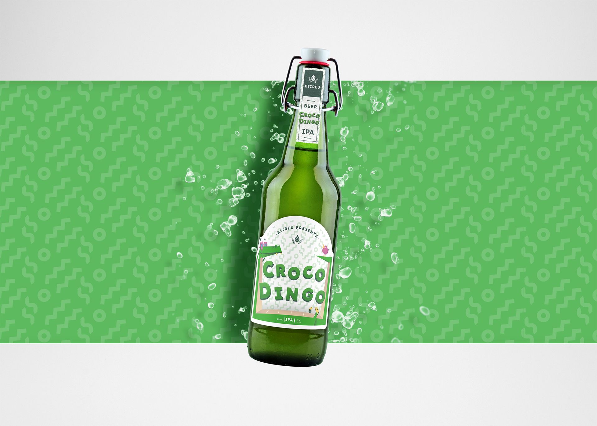 Projet d'illustration d'étiquette de la marque de bière "Biireu". Ils lancent une nouvelle IPA fraîche et légère pour l'été, intitulée "Croco Dingo". J'ai créé une illustration de style cartoon représentant un crocodile et un oiseau profitant du soleil. Les couleurs utilisées, le rose pour l'oiseau symbolisant la légèreté et le vert pour le crocodile et le houblon, apportent une touche joyeuse et estivale. Cette illustration sera déclinée sur les étiquettes de bouteilles, canettes et dessous de verre pour renforcer la visibilité et l'attrait du produit.