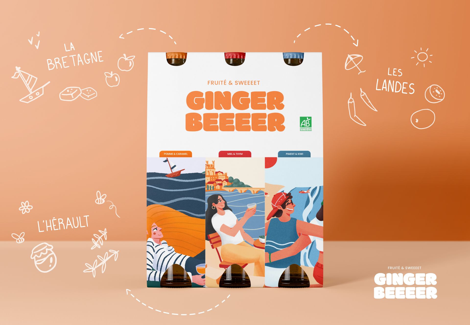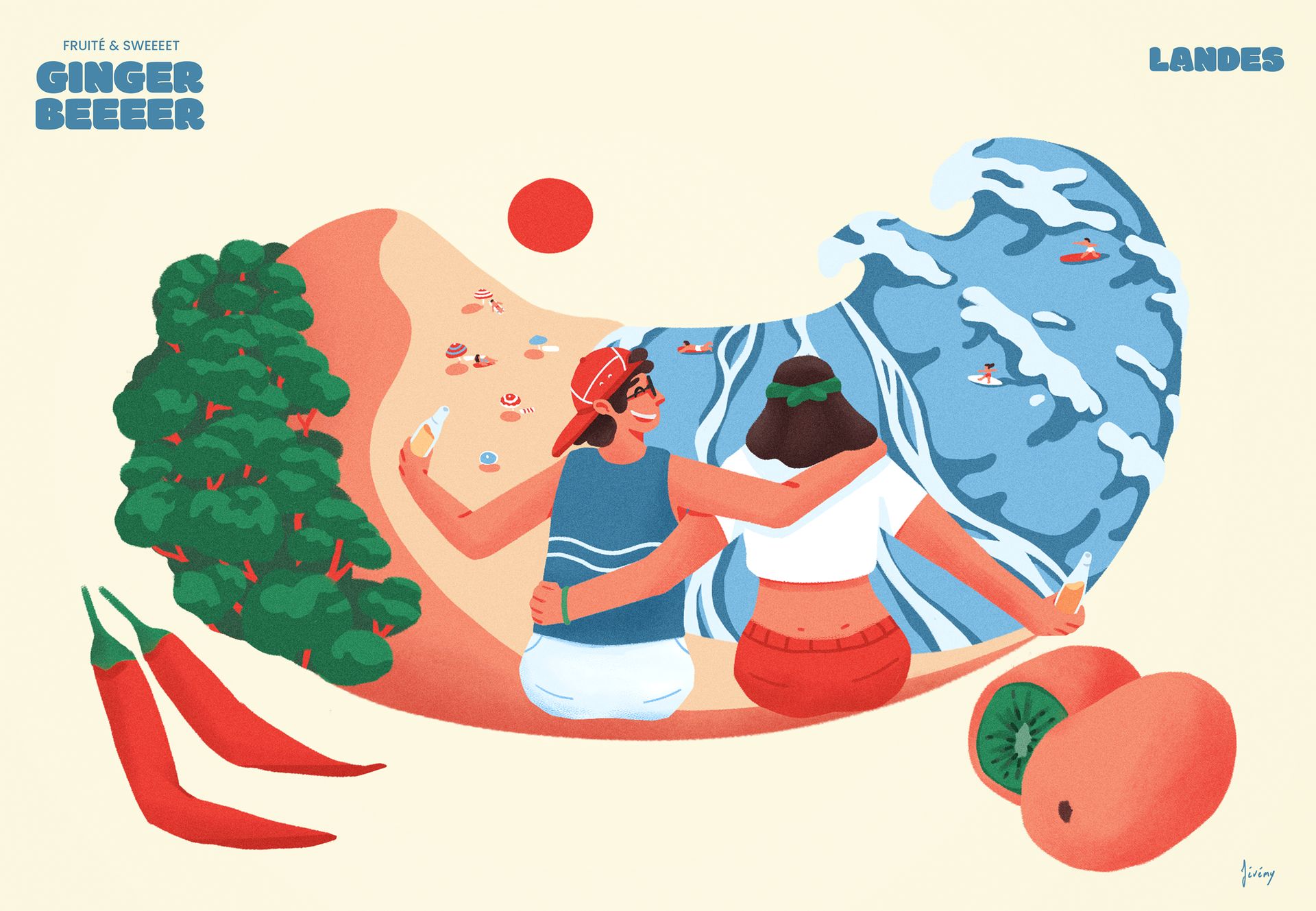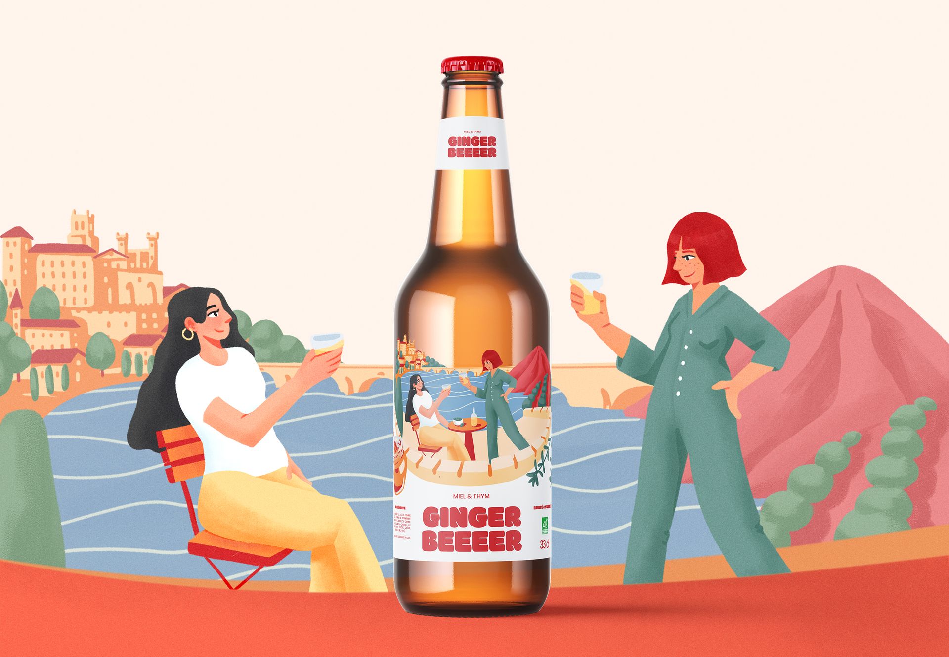 Cette série réunit trois illustrations conçues dans le cadre d’un projet d’étiquettes de ginger beer. Chaque visuel met en scène la rencontre entre le gingembre et des spécialités culinaire locales, imaginant ainsi des associations de saveurs originales et surprenantes.