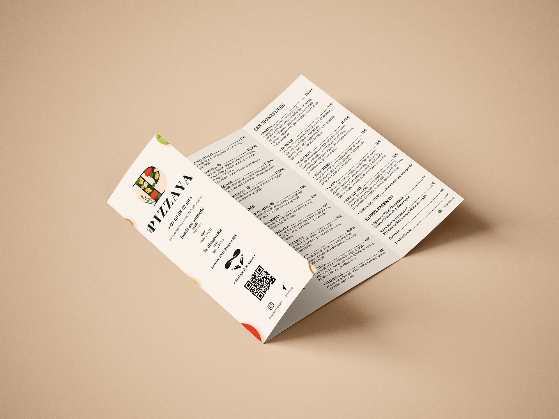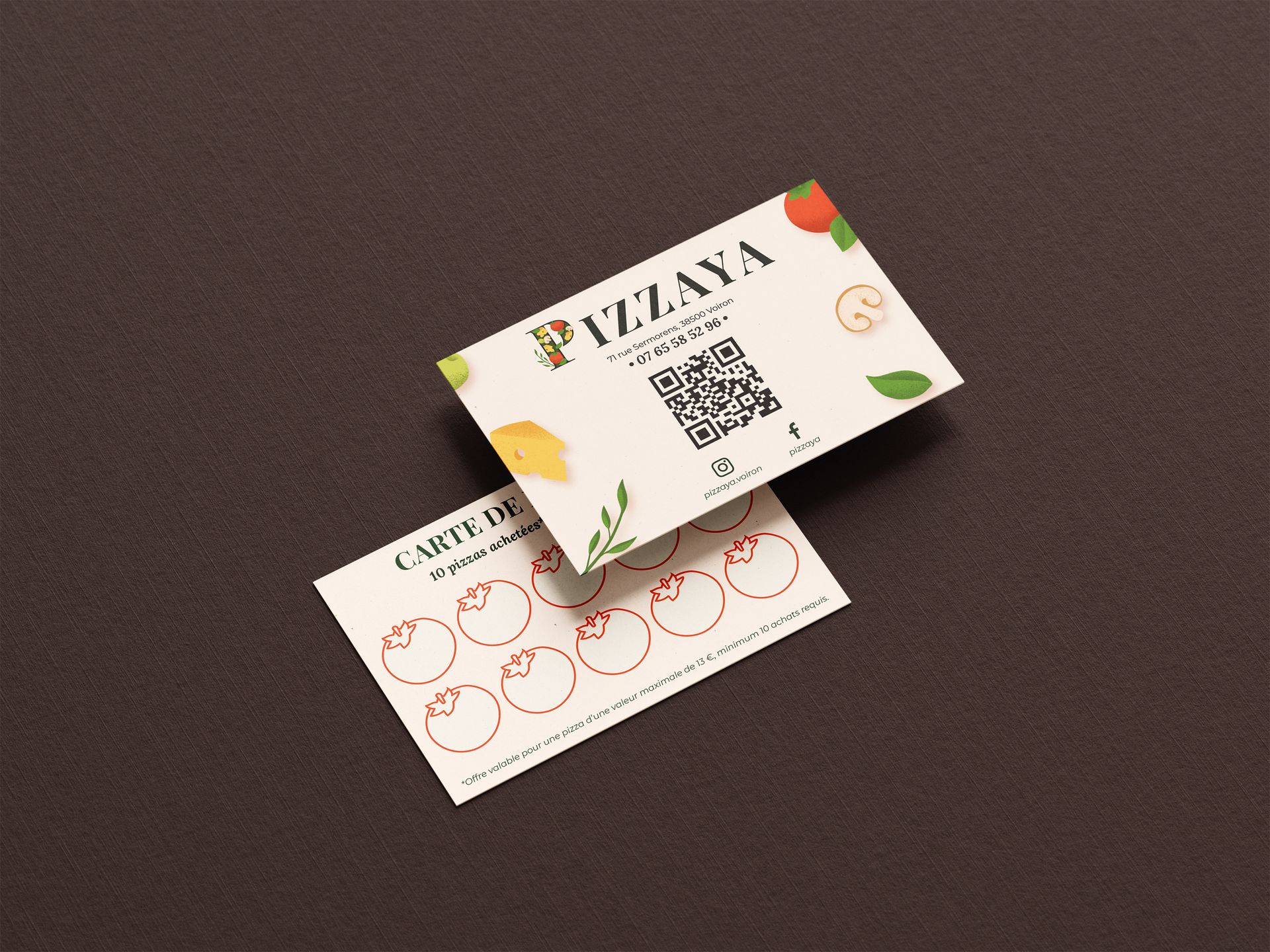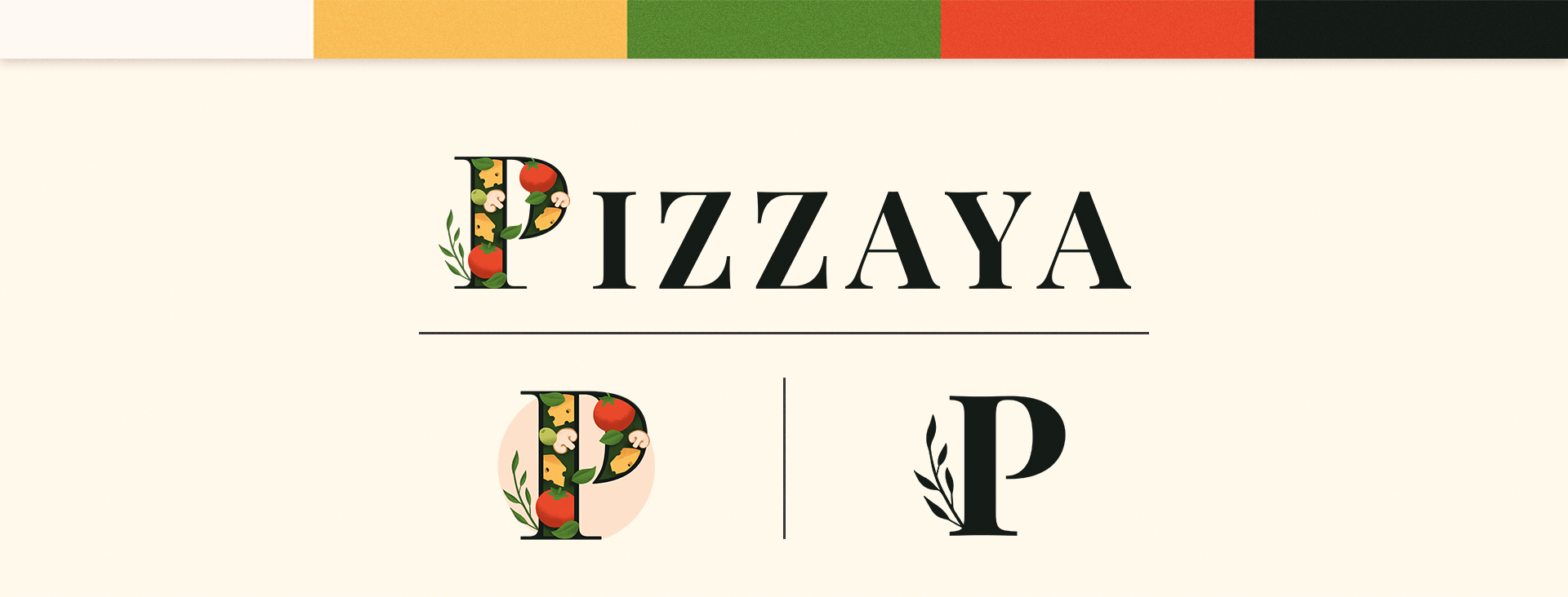Pour l’univers graphique de Pizzaya, l’identité repose sur trois piliers : la fraîcheur des produits, le savoir-faire artisanal et l’esprit convivial d’une véritable pizzeria. L’approche visuelle se veut moderne (logo simple et lisible), naturelle (palette de couleurs inspirée des ingrédients frais) et élégante (en évitant les clichés visuels trop évidents liés à la pizza).